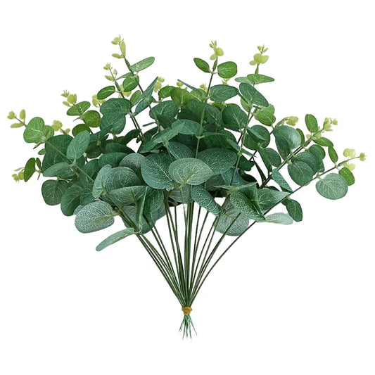 Regular price £13.99Regular priceUnit price / per£0.99Sale price £13.99Add a touch of timeless elegance to any setting with these stunning artificial eucalyptus leaves. **Introducing the Product** Our 10-Pack Artificial Eucalyptus Leaves Bunch offers a versatile and realistic touch to your decor needs. Perfect for a range of spaces, these faux greenery stems are crafted to bring the outdoors in, creating a serene and refreshing atmosphere whether used indoors or out. **Key Features** Designed to imitate the natural beauty of eucalyptus, each stem has been expertly crafted with high-quality silk materials, showcasing vivid, full-coloured leaves. These long-lasting artificial leaves require zero maintenance, retaining their beauty season after season. The stems are flexible and can be bent or cut to suit your creative requirements. **Compatibility & Usage** These eucalyptus leaves are a perfect addition to weddings, cake decorations, crafting projects, and various decor settings such as home or office spaces. Ideal for floral arrangements, these stems can be used as centerpieces or accent pieces to complement any theme or style. **Gift-Ready Options** Whether you're looking to elevate your home decor or want a unique gift idea for a loved one, these eucalyptus stems are delivered in a thoughtfully packaged bundle, ready to impress upon arrival. Perfect for housewarmings, anniversaries, or special occasions. **Why You’ll Love It** Embrace the beauty of nature without the upkeep. These faux eucalyptus leaves provide the aesthetic appeal of real foliage without wilting or seasonal restrictions. Experience the calming effect and subtle charm these leaves bring to any environment, enhancing your space with their lush and inviting presence. -