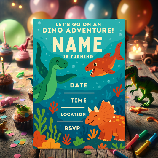 Get ready to spark joy with this vibrant Dinosaur Birthday Invitation digital template, designed to bring a prehistoric party adventure to life! Featuring playful, colourful dinosaurs in a lively underwater scene, this editable Canva design is ideal for boys and girls celebrating their special day.