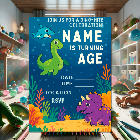 Make your child’s birthday roar with excitement using this vibrant Dinosaur Birthday Invitation template! This editable digital download features a playful underwater dino scene with cheerful dinosaurs in bright green, purple, and blue tones set against a deep ocean backdrop. The catchy “Dino-Mite Celebration” headline captures the fun, prehistoric party spirit perfectly.