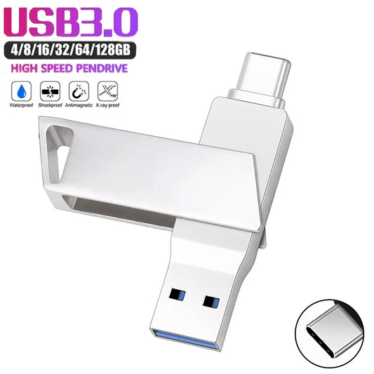 Regular price From £19.99Regular priceUnit price / per£0.99Sale price From £19.99Upgrade your storage game with the 64GB Rotatable Type-C USB 3.0 Flash Drive—built to withstand life's unexpected moments. Introducing the Drive Designed to deliver exceptional performance, this flash drive combines the latest USB 3.0 technology with a versatile Type-C interface. Crafted from robust metal, its rotatable design makes it both stylish and functional, offering easy access to your files whenever you need them. Whether you're a business professional or a photography enthusiast, this drive is the perfect companion for all your data storage needs. Key Features Experience seamless data transfer with high-speed USB 3.0, ensuring your files are ready when you are. Its durable, waterproof, and shatterproof construction means your personal and professional data will remain safe and secure in all conditions. Available in a sleek silver finish, this flash drive is more than just a storage device—it's a statement of elegance and reliability. Compatibility & Usage Compatible with a range of operating systems, including Windows 98 through to Windows 10 and Mac OS, this USB drive fits seamlessly into your digital ecosystem. It pairs effortlessly with PCs, laptops, phones, cars, and smart TVs, making it an indispensable tool across various devices and platforms. With multiple storage capacity options available, you can choose the perfect fit for your needs. Gift-Ready Options This flash drive makes for a versatile gift, ideal for business colleagues, creative photographers, or tech-savvy family members. Its eye-catching design and practical functionality are sure to impress anyone who receives it. Packaged for gifting, it’s a unique choice for anyone who appreciates reliable tech. Why You’ll Love It You'll love the peace of mind and convenience provided by t