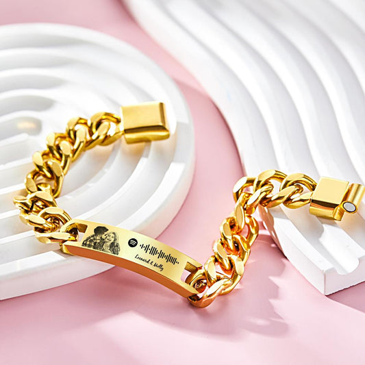 Regular price From £23.76Regular priceUnit price / perSale price From £23.76Celebrate your love in a truly unique way with the Personalized Spotify Code Bracelet with Your Photo. This stunning piece is more than just a bracelet; it’s a heartfelt keepsake that allows you to carry your favourite song and cherished memories with you wherever you go. Crafted from durable stainless steel, this bracelet is designed to symbolize the strength and longevity of your love.