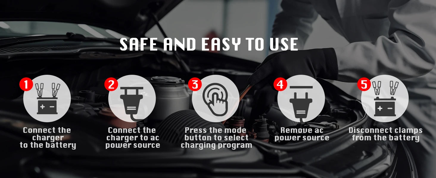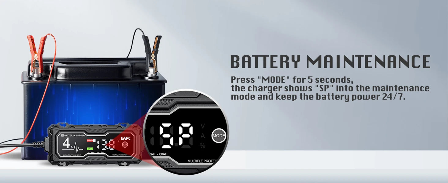 ✔ Designed for effortless use, this intelligent battery charger features a user-friendly LCD display and simple connection process, making charging your lead-acid batteries quick and hassle-free — perfect for saving time and ensuring reliable start-ups every time.